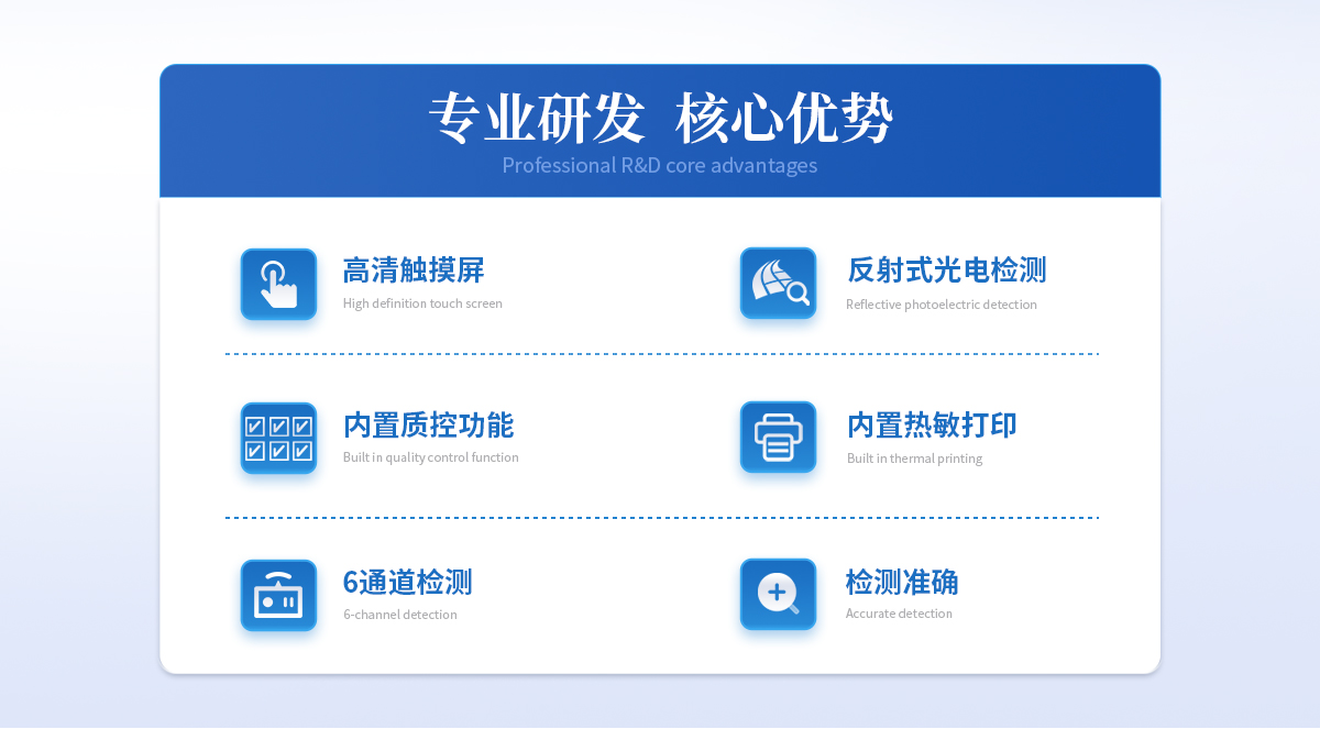 | 1、 Android触控系统结合大尺寸高清屏幕,界面友好,操作简单流畅,无需外接设备; | 2、 6通道可以同时检测不同项目,显著提升检测效率,满足批量样本快速处理需求; | 3、 二维码扫描录入样本信息,避免人工错误 | 4、 8G超大容量内存,支持按日期灵活查询、预览、删除结果,并生成多样化专业报告。 | 5、 内置热敏打印机,检测完成即可现场打印标准报告,提升工作效率。 | 6、 关键部件实时自诊断功能,保障仪器长期稳定运行。 | 7、 高速有线/无线网络及蓝牙,构建完善的数据监控平台,实现数据实时上传、远程查询、统计分析和监管协同。 | 8、 丰富的接口设计,轻松连接电脑、U盘、网络及上位机系统,支持U盘导出。 | 9、 孵育模块为特定试纸条反应提供**温度环境。 | 10、 流线型结构,紧凑轻便,兼顾实验室耐用性与检测需求。 | 11、 插卡判断:检测卡未插入检测通道不能内置质控功能,可设备送检、设备自检、试剂卡自检测方式:孵育检测、即时检测(对检测数据复检核实) | 12、 检测曲线:可以对试剂卡的检测核验,防止误判 | 13、 检测结果:报告出检测项目、被测物质的浓度、检测单位、被检查单位、检验员、检测时间、检测限等信息可在触摸屏上显示,可通过仪器内置打印机输出 | 14、 项目管理:支持检测项目拓展功能 | 15、 界面设置:可修改标题和页尾信息,灵活展示仪器信息 |