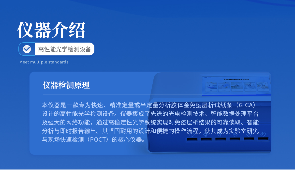 | 1、食品安全: 致病微生物、农兽药残留、生物毒素等快速筛查。 | 2、畜牧兽医: 动物疫病诊断、动物源性安全指标检测。 | 3、环境监测: 水质、土壤特定污染物筛查。 | 4、科研与生物安全: 免疫层析实验定量分析、生物因子检测。 | 5、其他领域: 所有使用胶体金免疫层析试纸条的场景。 |