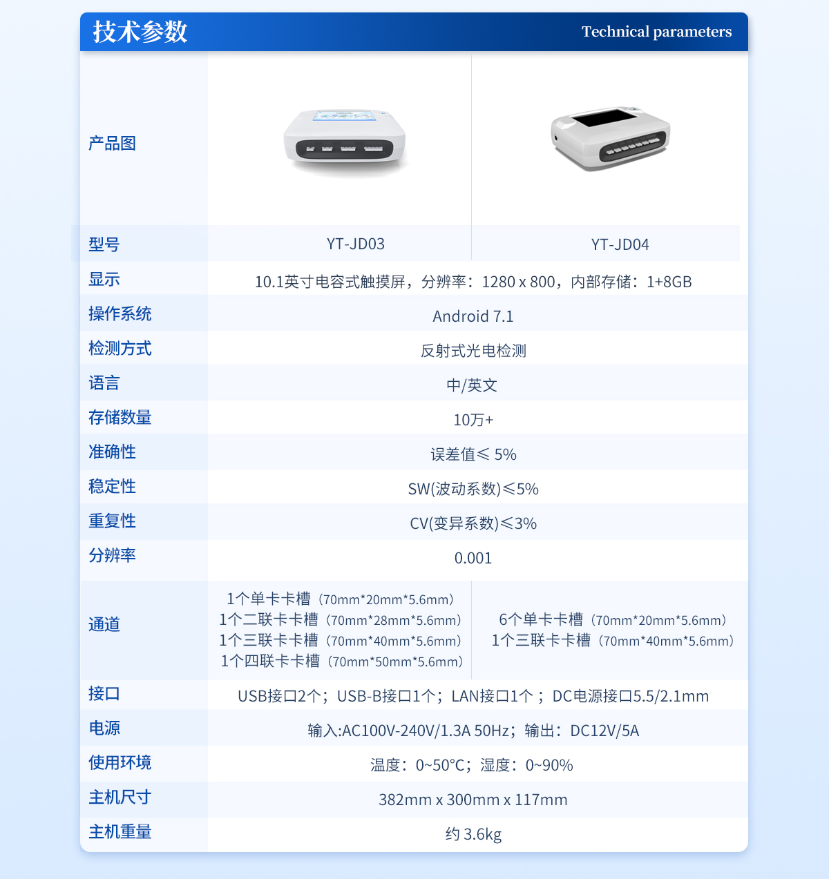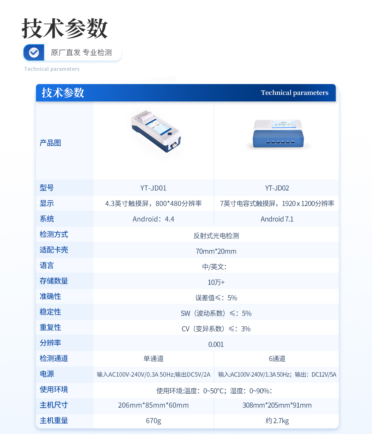 | 1、 7英寸电容式触摸屏,分辨率:1920:x:1200,内部存储:1+8GB | 2、 操作系统:Android:7.1 | 3、 检测方式:反射式光电适配卡壳:70mm*20mm | 4、 语言:中/英文: | 5、 存储数量:10万+ | 6、 准确性:误差值≤:5% | 7、 稳定性:SW(波动系数)≤5% | 8、 重复性:CV(变异系数)≤3% | 9、 分辨率:0.001 | 10、检测通道:6通道检测时间:<5秒(单卡及多联卡);可对样本进行胶体金定性/半定量检测。 | 11、数据传输:WiFi、蓝牙、USB、射频读卡、外置扫码模块(选配) | 12、数据处理:可通过通讯端口进行数据汇总、上传监管平台等 | 13、检测通道孵育检测一体,温度范围::室温:+5℃:~:60℃ | 14、打印机:热敏打印机(热敏打印纸:57*20mm) | 15、接口:USB接口:2个;USB-B接口:1个;LAN接口:1个:;DC电源接口:5.5/2.1mm | 16、电源:输入:AC100V-240V/1.3A 50Hz;输出:DC12V/5A | 17、使用环境:温度:0~50℃;湿度:0~90%: | 18、主机尺寸::308mm*205mm*91mm | 19、主机重量:约:2.7kg |