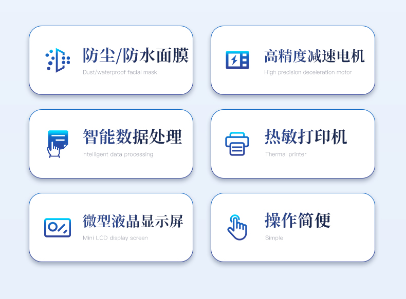 | 系统:Android10系统 | 显示:7寸触摸屏 | 数据存储:10万条 | 电源:AC 110V-240V/50-60Hz | 数据接口:USB/WIFI/网线 | 使用环境:温度:0℃--40℃ 湿度:10%--75% | 存储环境:温度:0℃--40℃ 湿度:10%--90% | 打印机:内置热敏打印机 | 尺寸:310*226*233mm | 重量:3.7kg |