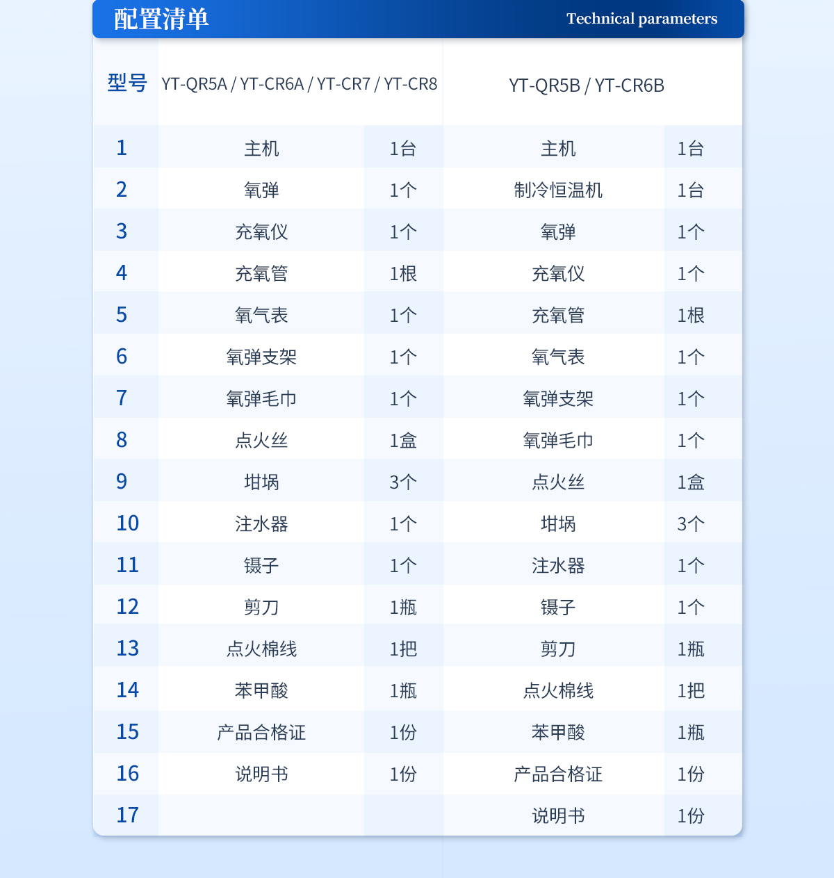 主机 1台 | 制冷恒温机 1台 | 氧弹 1个 | 充氧仪 1个 | 充氧管 1根 | 氧气表 1个 | 氧弹支架 1个 | 氧弹毛巾 1个 | 点火丝 1盒 | 坩埚 3个 | 注水器 1个 | 镊子 1个 | 剪刀 1瓶 | 点火棉线 1把 | 苯甲酸 1瓶 | 产品合格证 1份 | 说明书 1份 |