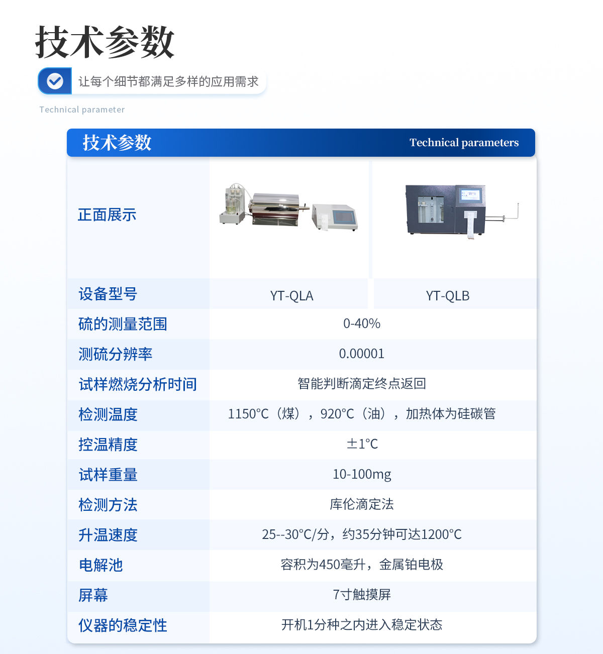 1.硫的测量范围:0—40%. | 2.单个试样燃烧分析时间:约5--7分钟,其中在500℃处停留45秒,1050℃处停留4分45秒。 | 3.控温:精度±5℃。测温:精度0.5级;加热体为硅碳管,高温区长度≥90毫米,温度为1050℃±5℃(根据需要可调节温度) | 4.精密度:如下表规定: | St,%<1 4="">4 | 重复性St,ad,% 0.05 0.10 0.20 | 再现型St,d,% 0.10 0.20 0.30 | 5.升温速度:20--25℃/分,约30分钟可达1050℃。 | 6.电解池:容积为450毫升,铂电解电极面积150mm2 。 | 7.供电电源:220(1±10%)V,50Hz. | 8.仪器尺寸(mm) 长×宽×高(770×460×410) |