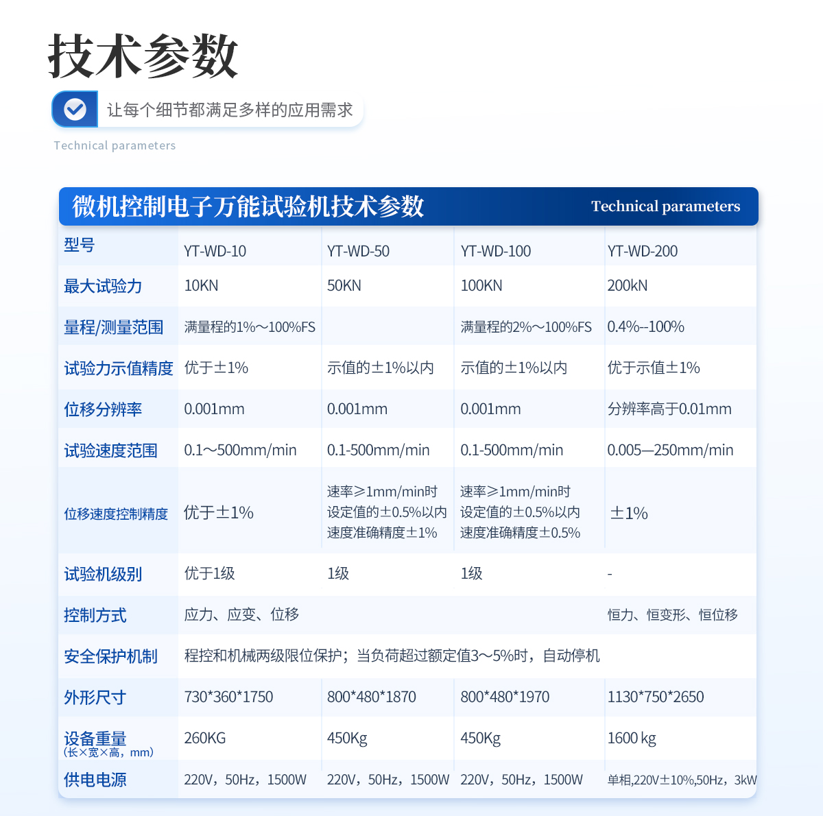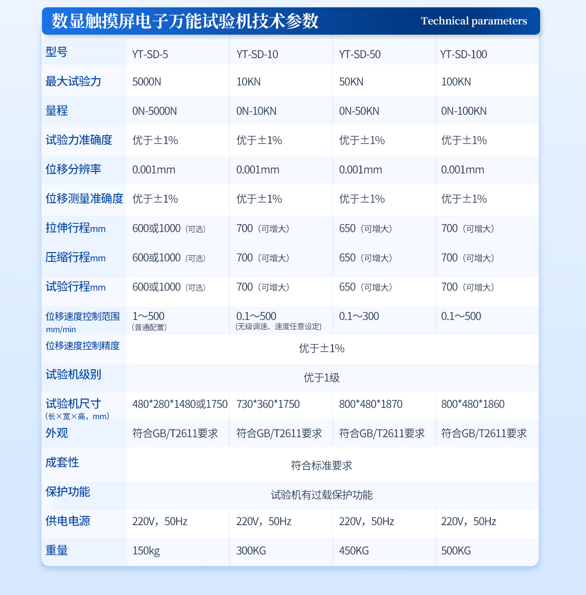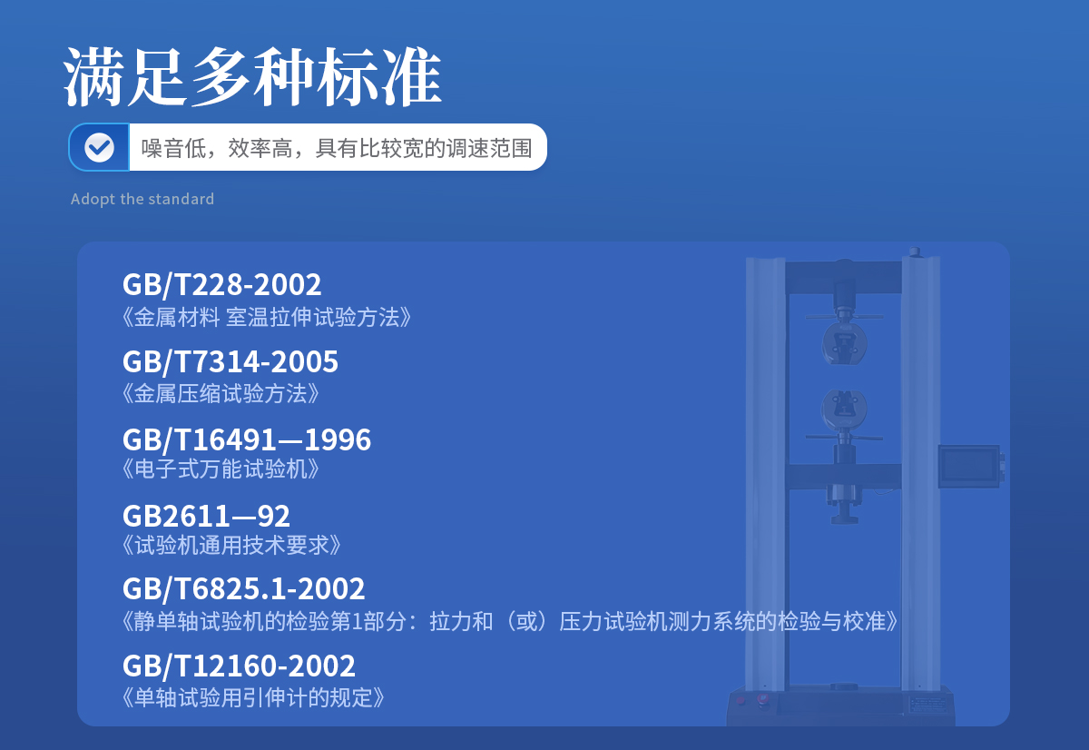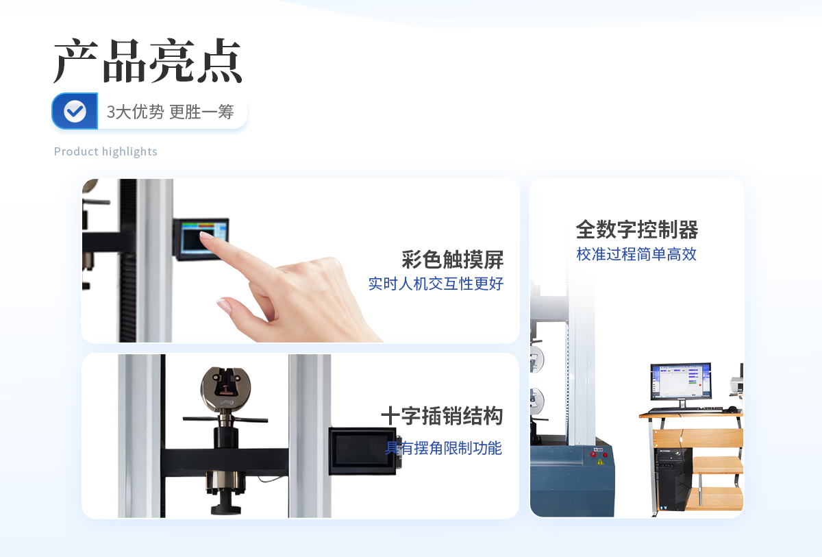 1、采用高精度、全数字调速系统及精密减速机,驱动精密丝杠副进行试验,实现试验速度的大范围调节,试验过程噪音低、运行平稳。 | 2、万向节采用十字插销结构,而且具有摆角限制功能,一方面便于试样夹持,保证试验同心度,另一方面很好的消除了不规则试样对传感器的影响。 | 3、触摸键操作方式,液晶显示器实时显示。显示界面可显示试验方法选择界面、试验参数选择界面、试验操作及结果显示界面和曲线显示界面,方便快捷。 | 4、可实现试样装夹时横梁快慢升降调整,具有过流、过压、过载等保护装置。 | 5、选配微机接口,可外接微机实现试验过程的控制及数据的存储、打印。 |