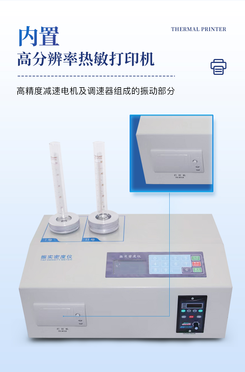| YT-ZS2型粉体密度测试仪是由丹东市恒瑞仪器有限公司依据标准GB/T 5162-2006/ISO3953:1993(金属粉末 振实密度的测定),并参照美国药典独立研发制造的粉体密度测试仪器,具有自主知识产权。仪器含盖准备GB/T 5162-2006/ISO3953:1993中的各项指标。 | YT-ZS2型粉体密度测试仪由可调速电机、振动组件、微电脑和微型打印机等部件组成。且仪器具有结构紧凑、牢固,操作简单等特点。 |